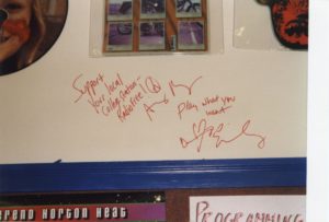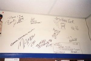 Emily of the Indigo Girls signs the office wall of fame (Oct 21, 1997)